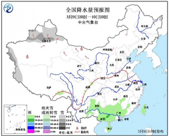 此外,已为新疆北部带来降雪和大风降温天气的较强冷空气今日继续向东推进。预计今天夜间到明天白天,较强冷空气将先后为新疆北部、西北地区中东部、内蒙古中西部等地带来大风和降温天气,大部地区降温幅度有4~8℃,南疆盆地、内蒙古中西部、甘肃西部等地的部分地区有扬沙或浮尘天气;新疆中北部和西南部、西藏西部等地有小雪到中雪,其中新疆沿天山一带局地有大雪。请上述地区的居民注意防寒保暖,出门活动尤其做好防风沙措施,避免沙尘进入口鼻。