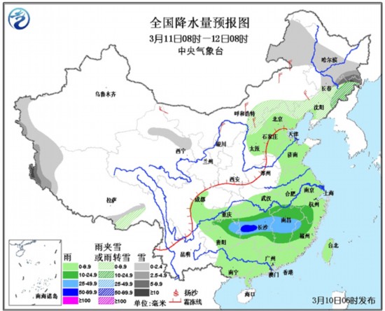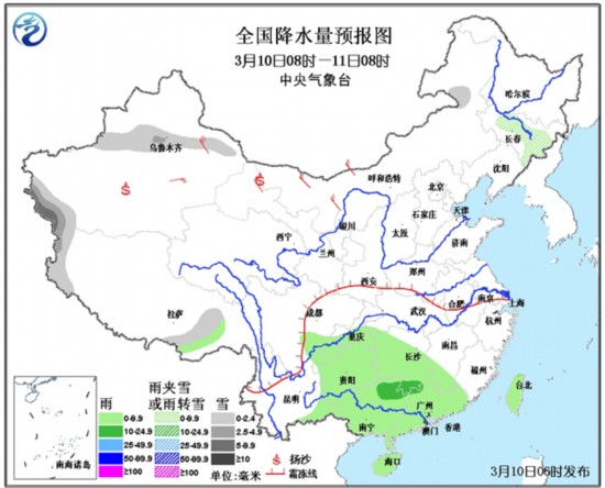 中央气象台最新降水预报显示,今天白天到夜间,将是未来三天中降水最弱的一天,只有在新疆西南部和沿天山一带、西藏西部和东南部等地有小到中雪或雨夹雪,其中,新疆西南部局地有大雪。