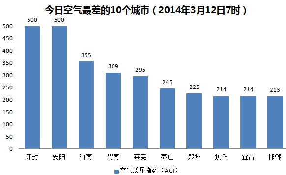 人民网北京3月12日电 (杨翼)根据环保部公布的最新数据,截至今天早上7时,开封和安阳的AQI(空气质量指数)“爆表”达到500,属于六级严重污染,成为161个参与空气质量排名的城市中空气质量最差的城市。今日空气质量最差的10个城市分别是开封、安阳、济南、渭南、莱芜、枣庄、郑州、焦作、宜昌和邯郸。其中开封、安阳、郑州、焦作等4个城市属于河南省,济南、莱芜、枣庄等3个城市属于山东省。
