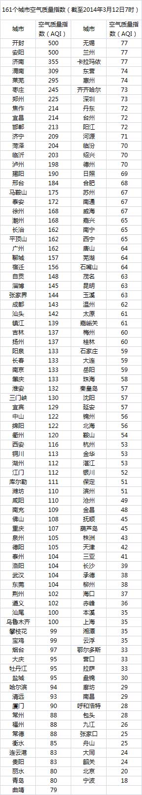 说明:自2014年1月1日起,环保部发布空气质量实时信息、空气质量月报及参与空气质量排名的地级城市已由74个增加到161个,包含了直辖市、省会城市、计划单列市、“三区”所有地级城市、环保重点城市和环保模范城市。人民网环保频道将采用环保部的官方数据,对161个城市每日空气质量进行排行。