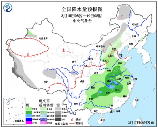 18日08时至19日08时,新疆西南部、西藏西部和东北部、内蒙古东北部、华北北部等地有小到中雪或雨夹雪,其中,西藏西部的局地有大到暴雪;华北中南部、黄淮、江汉、江淮、江南大部、西南地区东部、广西北部等地有小到中雨,其中,湖北东部、湖南西部的局地有大雨。内蒙古中东部、甘肃中西部、华北北部有4~5级风。甘肃西部等地的部分地区有扬沙或浮尘天气。