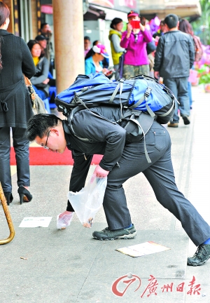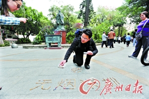 在东湖公园门口的东湖新城酒家门口,叶榄捡完了最后需要的几个烟头,便来到东湖公园里的孔子像前,用捡的烟头摆起了“无烟深圳”和禁烟标识。