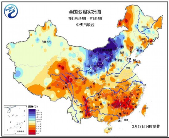 气象监测显示,今日14时,西北地区东部、内蒙古中西部以及华北地区西部的气温较昨日同时刻出现了4~8℃的下降,其中内蒙古中部局地降幅达15.7℃。而南方地区今天仍旧处于升温模式,其中江西、湖南以及福建等地出现了10℃以上的升温。另外,今天白天,北方风力加大,内蒙古中部、河北北部和山西北部等地出现了浮尘或扬沙天气。