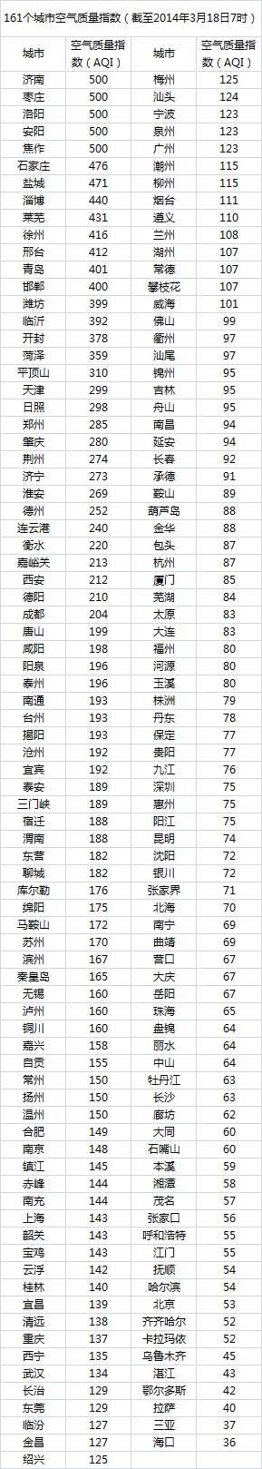 说明:自2014年1月1日起,环保部发布空气质量实时信息、空气质量月报及参与空气质量排名的地级城市已由74个增加到161个,包含了直辖市、省会城市、计划单列市、“三区”所有地级城市、环保重点城市和环保模范城市。人民网环保频道将采用环保部的官方数据,对161个城市每日空气质量进行排行。