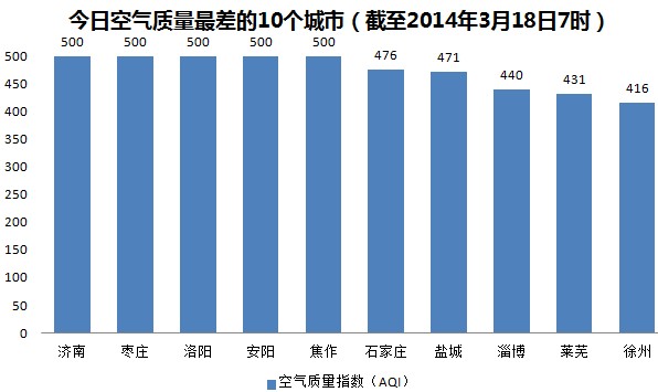 人民网北京3月18日电 (杨翼)根据环保部公布的最新数据,截至今天早上7时,济南、枣庄、洛阳、安阳和焦作等5个城市的AQI(空气质量指数)“爆表”,达到500,属于六级严重污染,是161个参与空气质量排名的城市中空气质量最差的城市。今日空气质量最差的10个城市分别是济南、枣庄、洛阳、安阳、焦作、石家庄、盐城、淄博、莱芜和徐州。