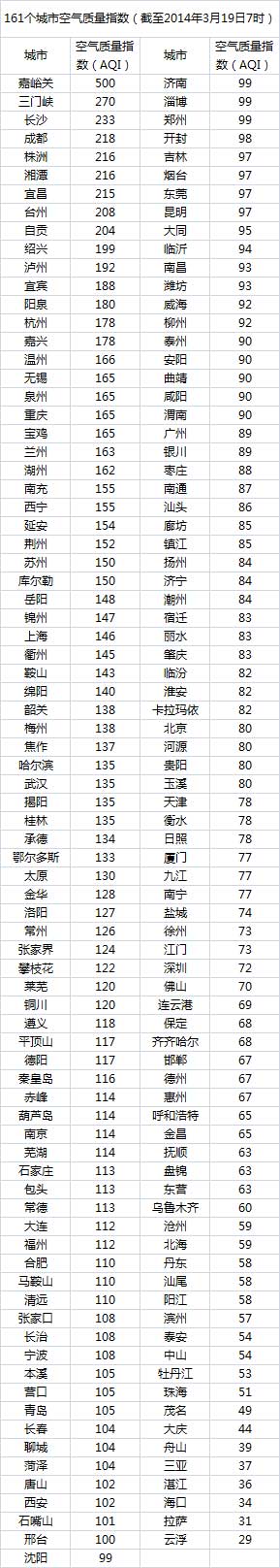 说明:自2014年1月1日起,环保部发布空气质量实时信息、空气质量月报及参与空气质量排名的地级城市已由74个增加到161个,包含了直辖市、省会城市、计划单列市、“三区”所有地级城市、环保重点城市和环保模范城市。人民网环保频道将采用环保部的官方数据,对161个城市每日空气质量进行排行。