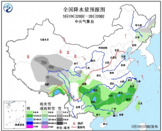 在冷空气残余势力以及南方暖湿气流的共同作用下,今天白天,江淮西南和东南部、江南北部等地出现了明显降雨天气。预计未来24小时,随着冷空气地迅速南下,江南南部、西南地区东部以及华南等地将先后出现降雨天气。大风降温方面,预计今天夜间到明天白天,西北地区东部、西南地区东部以及江南大部的气温都将出现6℃以上的降幅。