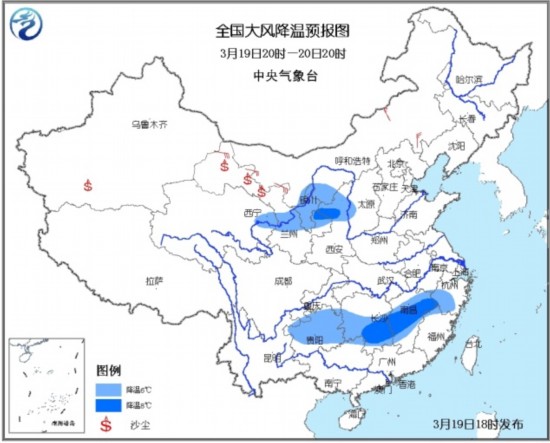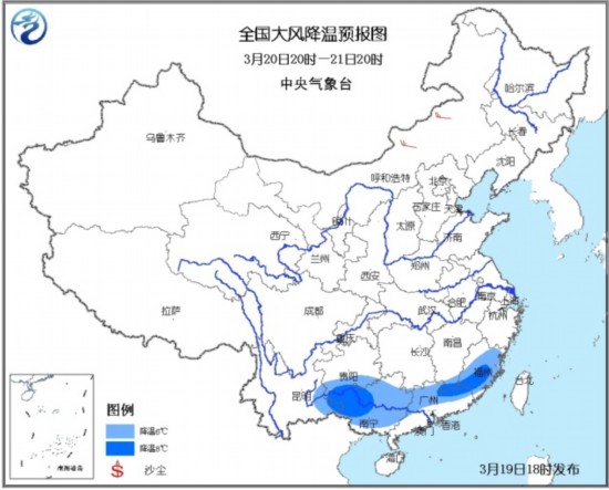 另外,今夜至21日,冷空气将继续移向我国。西北地区东部和南方大部地区的气温将下降4~8℃,局部地区降温幅度可达10℃。中东部大部分地区还将刮起4~6级偏北风。