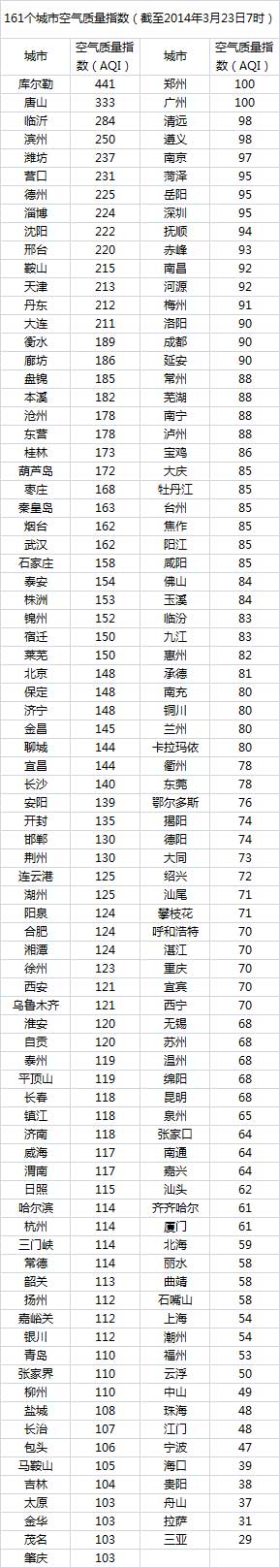 说明:自2014年1月1日起,环保部发布空气质量实时信息、空气质量月报及参与空气质量排名的地级城市已由74个增加到161个,包含了直辖市、省会城市、计划单列市、“三区”所有地级城市、环保重点城市和环保模范城市。人民网环保频道将采用环保部的官方数据,对161个城市每日空气质量进行排行。
