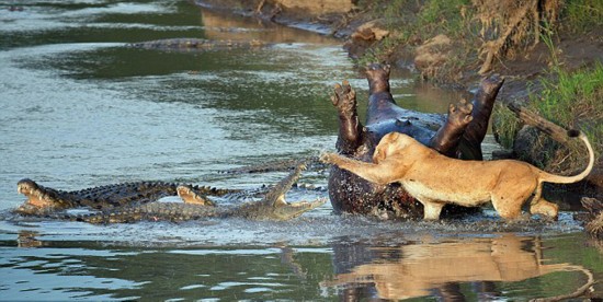 冲突:这头饥饿的母狮试图攻击三只潜在水中的鳄鱼。
