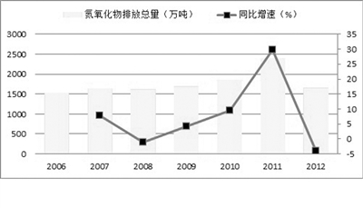 2006~2012年我国氮氧化物排放总量及增速