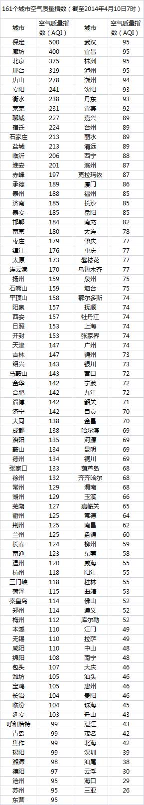 说明:自2014年1月1日起,环保部发布空气质量实时信息、空气质量月报及参与空气质量排名的地级城市已由74个增加到161个,包含了直辖市、省会城市、计划单列市、“三区”所有地级城市、环保重点城市和环保模范城市。人民网环保频道将采用环保部的官方数据,对161个城市每日空气质量进行排行。