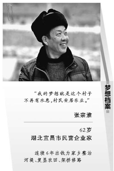 张宗淮是湖北宜昌夷陵区唐家坝村土生土长的农民,后来离家做生意赚了钱,因一直牵挂着家乡的水患,索性拿出钱来整治河堤、复垦农田、架桥修路,完成自己的心愿。他想让水患肆虐的家乡变成“小江南”。