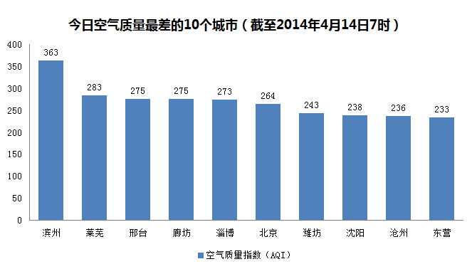 人民网北京4月14日电 根据环保部公布的最新数据,截至今天早上7时,滨州的AQI(空气质量指数)363,属于严重污染,成为161个参与空气质量排名的城市中空气质量最差的城市。今日空气质量最差的10个城市分别是滨州、莱芜、邢台、廊坊、淄博、北京、潍坊、沈阳、沧州和东营。全国仅滨州1个城市属于严重污染。重度及重度以上污染城市主要集中在东部地区。