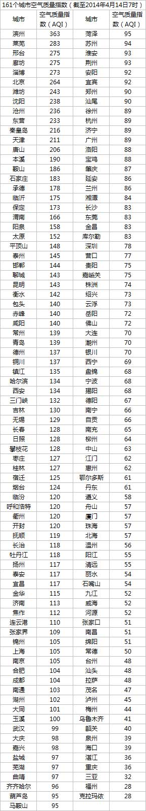 说明:自2014年1月1日起,环保部发布空气质量实时信息、空气质量月报及参与空气质量排名的地级城市已由74个增加到161个,包含了直辖市、省会城市、计划单列市、“三区”所有地级城市、环保重点城市和环保模范城市。人民网环保频道将采用环保部的官方数据,对161个城市每日空气质量进行排行。(实习生 朱宁君)