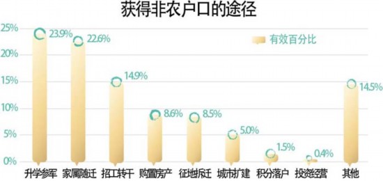 "清华大学中国城镇化调查研究"又发布新成果。根据调查报告,当前获得非农户口的方式仍主要沿袭计划经济体制下的户籍转变办法,通过升学参军和家属随迁的渠道转成非农户籍的比例仍然占大头。