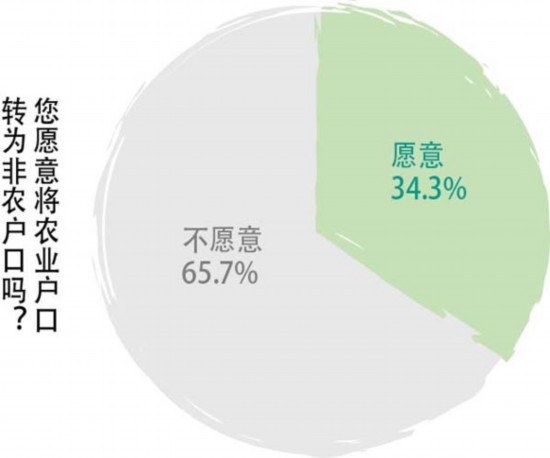 接受清华大学城镇化调查的人中,目前持农业户籍的,约有65.7%的人不愿意转换到非农户籍,只有34.3%的人愿意转非农户籍。