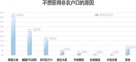 持农业户籍的人不愿意将户口转换为非农户籍有多方面原因。有近一半的人想保留土地。