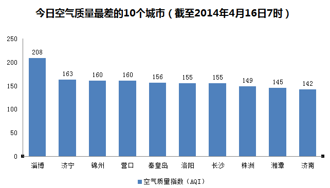 人民网北京4月15日电 根据环保部公布的最新数据,截至今天早上7时,淄博的AQI(空气质量指数)达到208,属于重度污染,成为161个参与空气质量排名的城市中空气质量最差的城市。今日空气质量最差的10个城市分别是淄博、济宁、锦州、营口、秦皇岛、洛阳、长沙、株洲、湘潭和济南。仅一城重度污染。