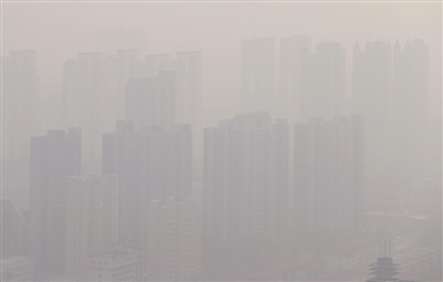 4月8日傍晚,石家庄,远处楼宇隐没于雾霾中。 新京报记者 尹亚飞 摄