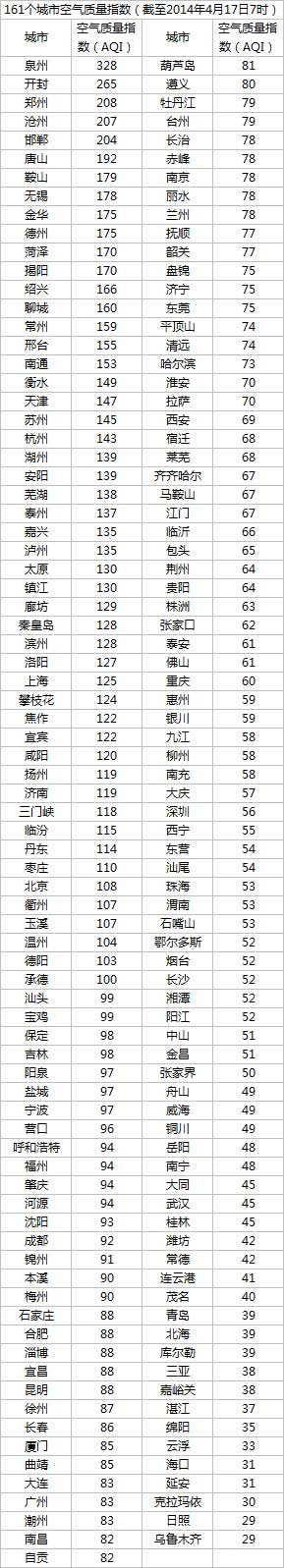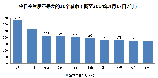 人民网北京4月17日电 根据环保部公布的最新数据,截至今天早上7时,泉州的AQI(空气质量指数)达到328,属于严重污染,成为161个参与空气质量排名的城市中空气质量最差的城市。今日空气质量最差的10个城市分别是泉州、开封、郑州、沧州、邯郸、唐山、鞍山、无锡、金华和德州。其中开封、郑州、沧州和邯郸为重度污染。