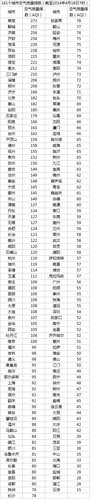说明:自2014年1月1日起,环保部发布空气质量实时信息、空气质量月报及参与空气质量排名的地级城市已由74个增加到161个,包含了直辖市、省会城市、计划单列市、“三区”所有地级城市、环保重点城市和环保模范城市。人民网环保频道将采用环保部的官方数据,对161个城市每日空气质量进行排行。(实习生 朱宁君)