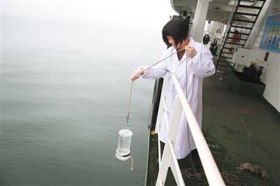 17日,曹妃甸港,工作人员正在对海水进行取样。