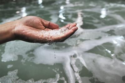 一名工人捧起气浮池内海水的气泡观察气浮效果。通过这道程序,海水中的污染物会被过滤掉。