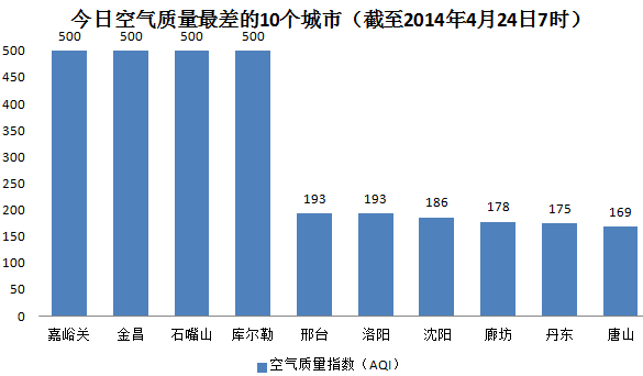 人民网北京4月24日电 (杨翼)根据环保部公布的最新数据,截至今天早上7时,嘉峪关、金昌、石嘴山和库尔勒的AQI(空气质量指数)一起“爆表”达到500,属于严重污染,成为161个参与空气质量排名的城市中空气质量最差的城市。今日空气质量最差的10个城市分别是嘉峪关、金昌、石嘴山、库尔勒、邢台、洛阳、廊坊、丹东和唐山。