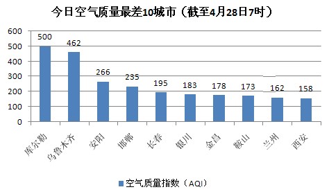 人民网北京4月28日电(记者蒋琪) 根据环保部公布的最新数据,今天库尔勒的AQI(空气质量指数)再次“爆表”达到500,属于六级严重污染,成为161个参与空气质量排名的城市中空气质量最差的城市。截至今天早上7时,今日空气质量最差的10个城市分别是库尔勒、乌鲁木齐、安阳、邯郸、长春、银川、金昌、鞍山、兰州、西安,其中库尔勒、乌鲁木齐、安阳、邯郸重度及重度以上污染的城市。
