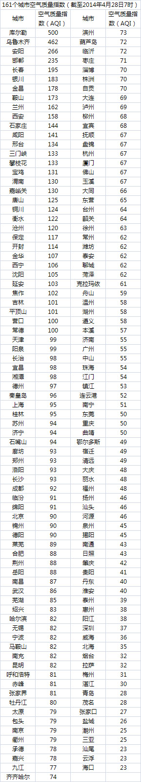 说明:自2014年1月1日起,环保部发布空气质量实时信息、空气质量月报及参与空气质量排名的地级城市已由74个增加到161个,包含了直辖市、省会城市、计划单列市、“三区”所有地级城市、环保重点城市和环保模范城市。人民网环保频道将采用环保部的官方数据,对161个城市每日空气质量进行排行。