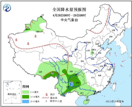28日08时至29日08时,青藏高原东部等地有小到中雪(雨)或雨夹雪,新疆西北部、西南地区大部、华南中西部有小到中雨,其中,云南东北部和南部、贵州西南部局地有大雨。新疆北部有5~6级风,南疆盆地的部分地区有浮尘或扬沙。黄海中部和南部、东海北部有6~7级、阵风8~9级的大风。