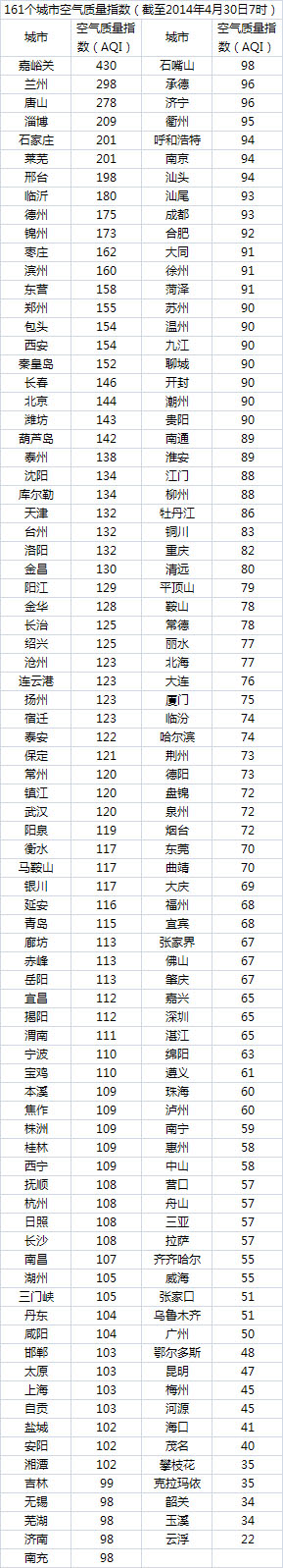 说明:自2014年1月1日起,环保部发布空气质量实时信息、空气质量月报及参与空气质量排名的地级城市已由74个增加到161个,包含了直辖市、省会城市、计划单列市、“三区”所有地级城市、环保重点城市和环保模范城市。人民网环保频道将采用环保部的官方数据,对161个城市每日空气质量进行排行。