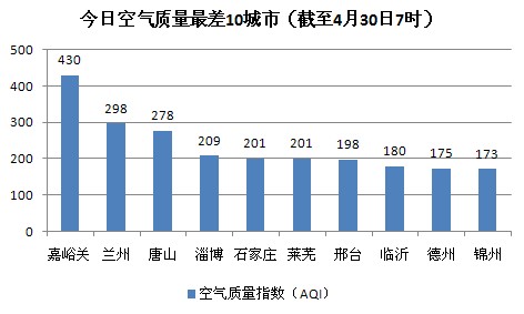 人民网北京4月30日电(记者蒋琪) 根据环保部公布的最新数据,今天嘉峪关的AQI(空气质量指数)达到430,成为161个参与空气质量排名的城市中空气质量最差的城市。截至今天早上7时,今日空气质量最差的10个城市分别是嘉峪关、兰州、唐山、淄博、石家庄、莱芜、邢台、临沂、德州、银川,其中兰州、唐山、淄博、石家庄、莱芜为重度及重度以上污染的城市。