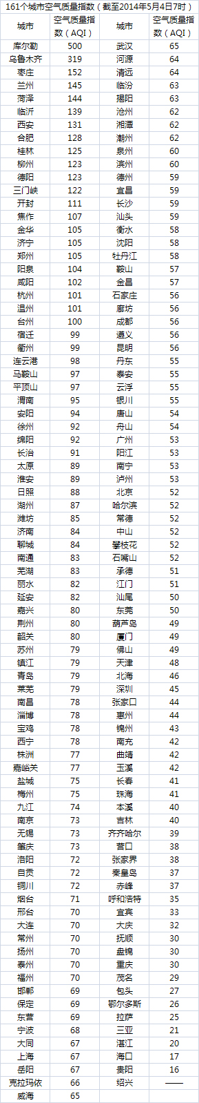 说明:自2014年1月1日起,环保部发布空气质量实时信息、空气质量月报及参与空气质量排名的地级城市已由74个增加到161个,包含了直辖市、省会城市、计划单列市、“三区”所有地级城市、环保重点城市和环保模范城市。人民网环保频道将采用环保部的官方数据,对161个城市每日空气质量进行排行。