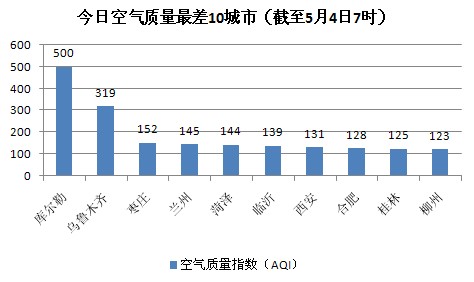 人民网北京5月4日电 (记者蒋琪)根据环保部公布的最新数据,截至今天早上7时,库尔勒的AQI(空气质量指数)500,属于六级严重污染,成为161个参与空气质量排名的城市中空气质量最差的城市。今日空气质量最差的10个城市分别是库尔勒、乌鲁木齐、枣庄、兰州、菏泽、临沂、西安、合肥、桂林、柳州。全国仅库尔勒、乌鲁木齐2个城市属于严重污染。
