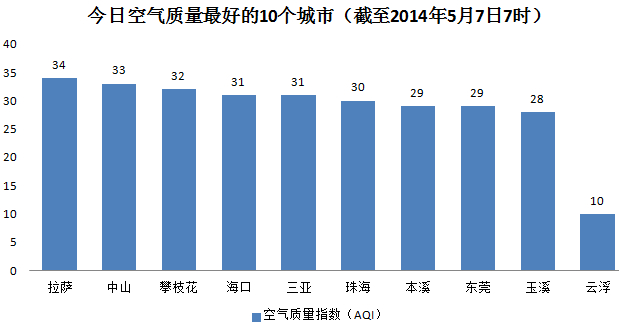 今日空气质量最好的10个城市分别是拉萨、中山、攀枝花、海口、三亚、珠海、本溪、东莞、玉溪和云浮。