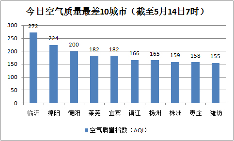 人民网北京5月14日电 (李楠桦) 根据环保部公布的最新数据,截至今天早上7时,临沂的AQI(空气质量指数)为272,属于重度污染,成为161个参与空气质量排名的城市中空气质量最差的城市。今日空气质量最差的10个城市分别是临沂、绵阳、德阳、莱芜、宜宾、镇江、扬州、株洲、枣庄、潍坊。宜宾的AQI为182,属于重度污染,已连续两日入围空气质量最差十城市。