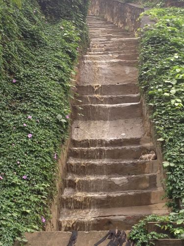 沿着水流向下,在暂存池与山体相连的拐角处,另有一道性状类似的水流从山体上沿着宽约一米的水泥台阶直泻而下,泛着黄色泡沫,汇入水渠。水渠沿着渗滤液暂存池堤坝底部,转90度后折而进入更深的一道沟渠,一路下行,最终流入两米多深的一处管道,没入地下。