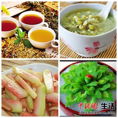夏季饮食以清淡、苦寒、富有营养、易消化的食物为佳,避免用粘腻碍胃难以消化的食物,勿过饱过饥。要适当多吃一些苦味的食物,夏季酷暑炎热、高温湿重,吃苦味食物,就能清泄暑热,以燥其湿。夏季汗多易伤阴,食酸则能敛汗。以下四大常见食谱则可有效消暑降温。