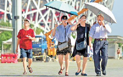5月29日,几名在奥林匹克公园游玩的游客边走边吃冰棍。当日,北京市预警中心在13时升级发布高温红色预警信号。 |