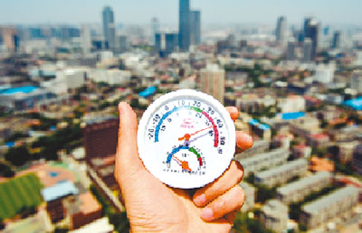 5月29日午间,天津市南京路用温度计测得的气温接近40℃。 |