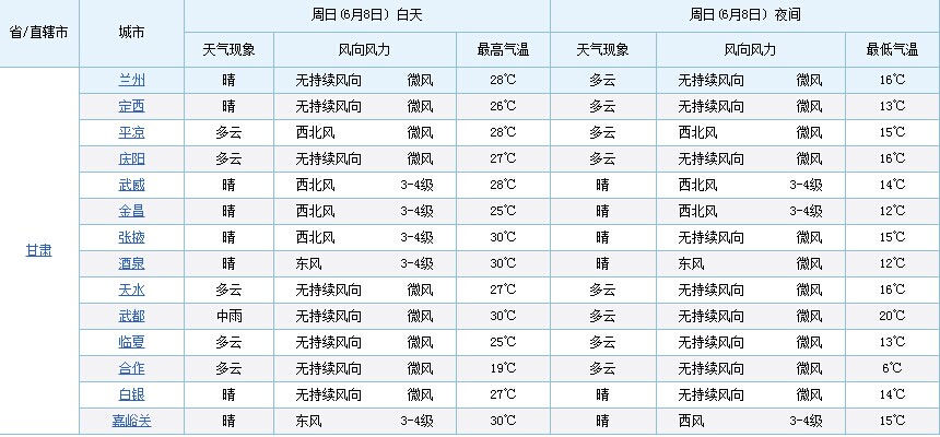 人民网北京6月5日电(蒋琪)据中央气象台最新消息,高考第一天(6月7日)甘肃省以多云和晴天为主,5市有雨。高考第二天(6月8日)白天甘肃省武都有中雨,提醒考生和家长注意出行。