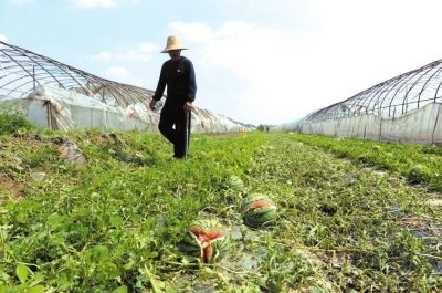 昨天下午,记者来到魏善庄镇受灾瓜地,只见很多露天西瓜被砸开,不少西瓜大棚倒地,棚子上的塑料膜出现破洞。