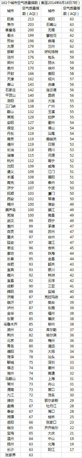 说明:自2014年1月1日起,环保部发布空气质量实时信息、空气质量月报及参与空气质量排名的地级城市已由74个增加到161个,包含了直辖市、省会城市、计划单列市、“三区”所有地级城市、环保重点城市和环保模范城市。人民网环保频道将采用环保部的官方数据,对161个城市每日空气质量进行排行。
