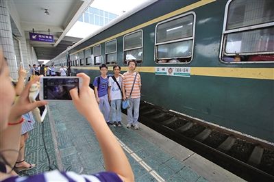 昨日下午,不少旅客在发车前与绿皮火车留影。刘伟摄