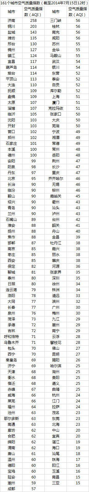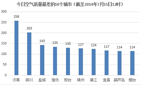 人民网北京7月15日电 (记者蒋琪)根据环保部公布的最新数据,截至今天早上12时,济南的AQI(空气质量指数)为258,属于严重污染,成为161个参与空气质量排名的城市中空气质量最差的城市。今日空气质量最差的10个城市分别是济南、铜川、盐城、潍坊、邢台、锦州、镇江、宜昌、葫芦岛、烟台。其中济南、潍坊、烟台三城属于山东省。
