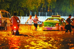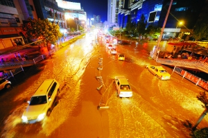 当晚9时,记者在西关什字看到,路面积水严重,堵车的长龙从西关什字转盘一直延伸至庆阳路,在南关什字,路面中央积水约有20厘米深,东西方向堵车严重。
