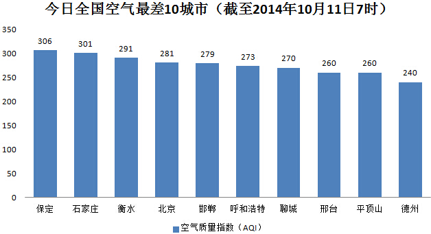 人民网北京10月11日电 (杨翼)根据环保部公布的最新数据,截至今天早上7时,保定的AQI(空气质量指数)为306,属于严重污染,成为全国161个参与空气质量排名的城市中空气质量最差的城市。今日空气质量最差的10个城市分别是保定、石家庄、衡水、北京、邯郸、呼和浩特、聊城、邢台、平顶山和德州。包括郑州、阳泉、长治、焦作、开封、抚顺、长春、潍坊以及以上10个空气最差的城市,截至今天早上7时,全国共有18个城市空气为重度污染及严重污染,比昨天少22%。