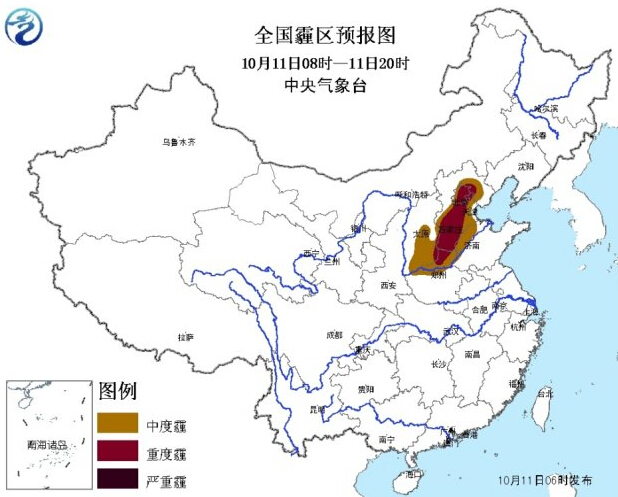 中央气象台今晨06时继续发布霾橙色预警,预计11日08时至11日20时,北京、天津、河北中南部和东北部、山东西部、河南北部、山西南部等地的部分地区有中度霾,其中北京、天津北部、河北中南部、河南西北部等地局部有重度霾。北京、天津北部、河北南部和东北部等地的部分地区有能见度不足500米的浓雾,局地有能见度不足200米的强浓雾。11日夜间起,上述地区的霾将自北向南逐渐消散。